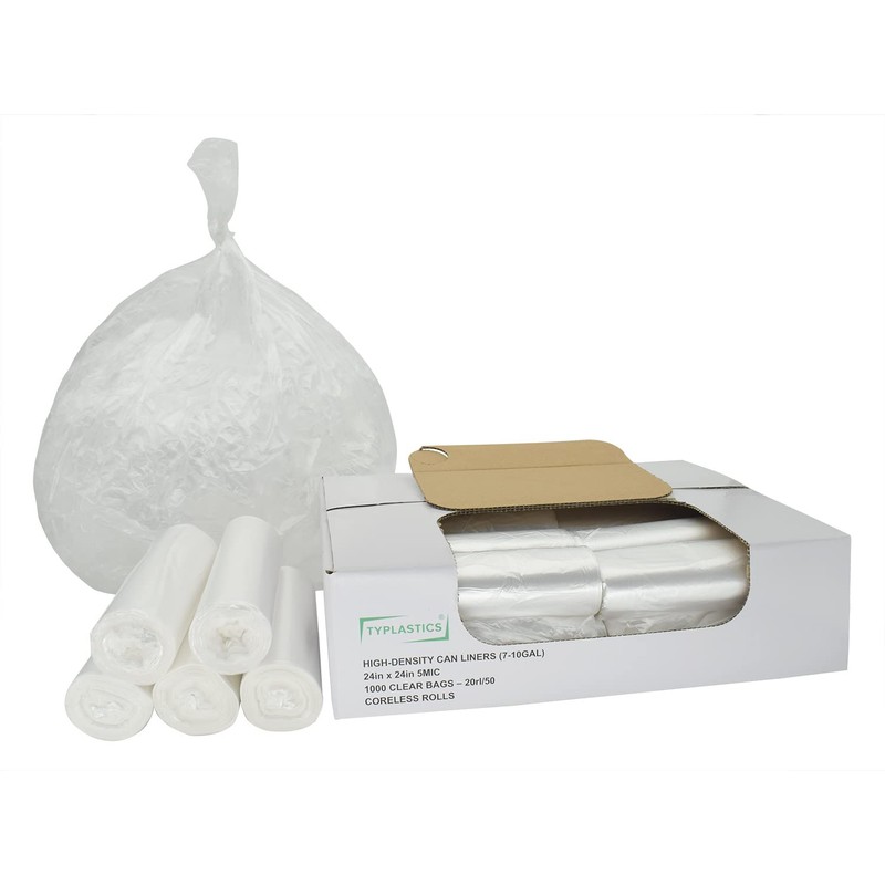 - 7-10 Gallon Can Liners: 1,000 count. Scent free. Size: 24" x 24". Packing: 50 clear bags per roll, 20 rolls per box.