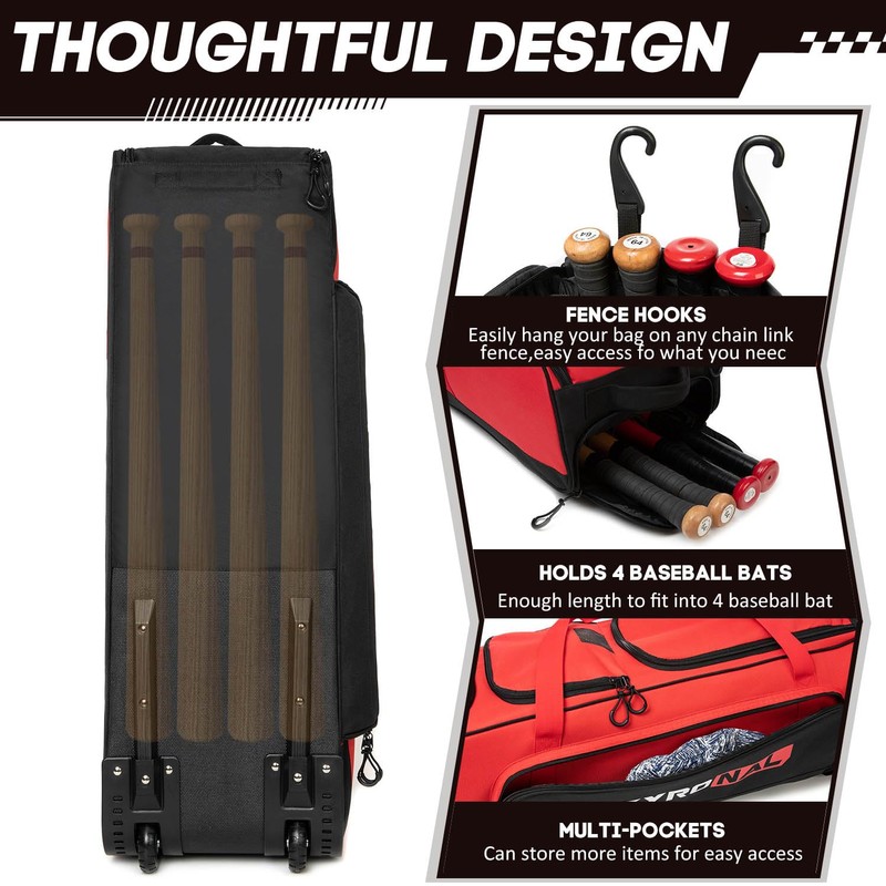 TYRONAL Baseball Bag with Wheels for 4 Bats,Soft Rolling Baseball Bag With Multi-Pockets, Fence Hook, Holds All Equipment. (Red/Blk)