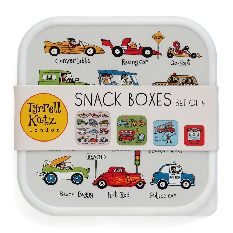 Tyrrell Katz Kids Snack Boxes with Cars Print - Children's 4 Piece Set - Freezer Safe Square Food Storage Containers