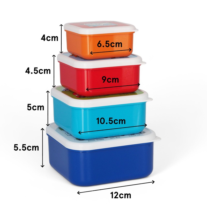 - Set of 4 Working Wheels design square shaped nesting boxes perfect for healthy snacks on the go