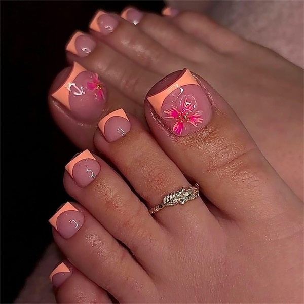 Tyuimhx Orange French Tip Press on Toenails Square Fake Toe Nail 3D Flowers False Toenails Acrylic Glue on Toe Nail Glossy Floral Artificial Stick on Toe Nail for Women 24 Pcs
