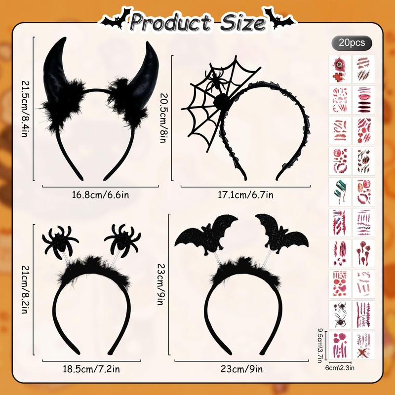 - Versatile Halloween headband set: Our black Halloween tiara set contains 4 different hair bands, including 1 bat headband, 1 spider headband, 1 spider web headband and 1 cow horn hair band. Whether you are looking for a mysterious vampire style or a glamorous bat look, we have the hair bands you need.