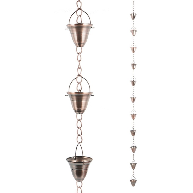 - Unique Design: Copper lily rain chain with wide mouth to collect more water and transport water from cup to cup, narrow down to avoid from splashing.