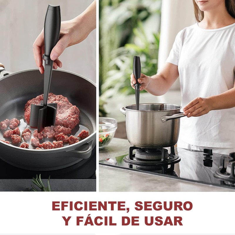 - ALTA CALIDAD Y SEGURO: Nuestro triturador de carne molida está hecho de material de nylon muy sólido, sin BPA, antiadherente, sin olor y con una resistencia a altas temperaturas de hasta 440 °F; es seguro de usar en todo tipo de utensilios de cocina, incluyendo antiadherente y revestido.
