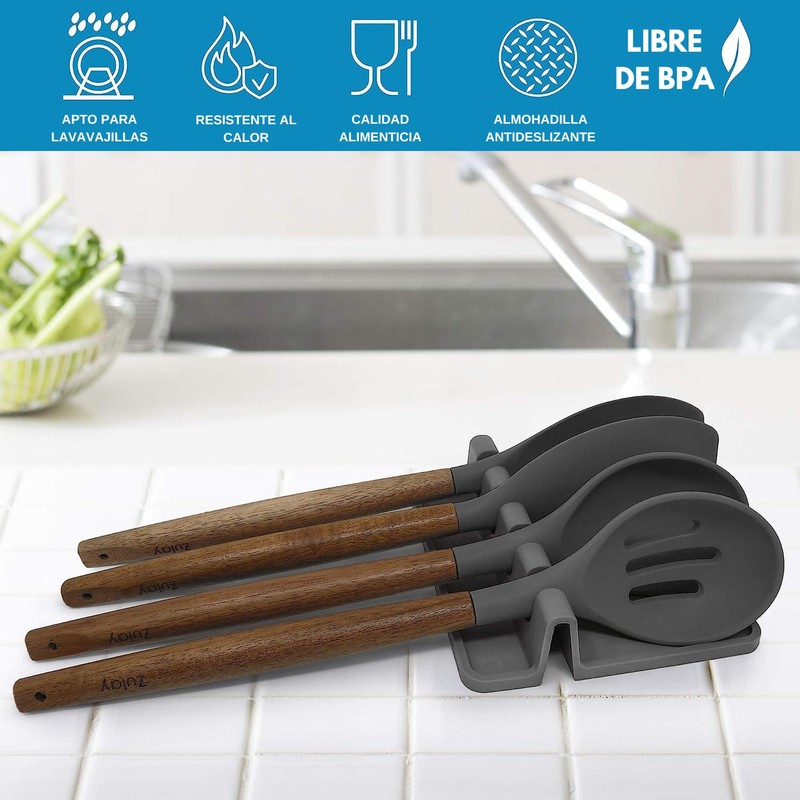 U Chef Soporte para Utensilios de Cocina de Silicona, Porta Cucharas, Soporte para Cucharones, Espátulas, Pinzas, Resistente al Calor y con Bandeja Antigoteo