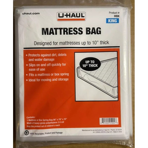 - Use U-Haul’s standard king mattress bag to protect your mattress or box spring from dirt, debris, moisture, and other damage while moving, during a renovation, or while in storage