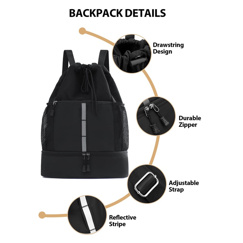 U.helper Waterproof Gym Drawstring Backpack, Sports Sack with Shoes Compartment & Wet Pockets for Ball/Beach/Swim Training (Black)