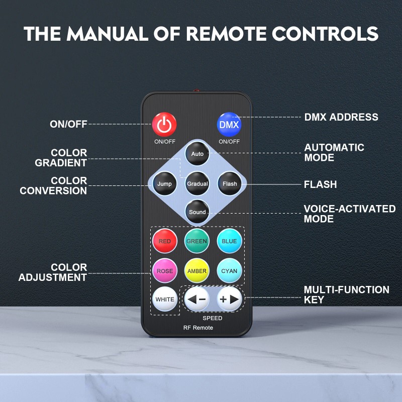 - Effortless Lighting Control: Take charge of your lighting with ease. Control the disco light from the rear panel or opt for the convenience of the included remote control. For advanced users, a professional DMX controller (not included) is also compatible. The remote control can manage multiple spotlights simultaneously, with a range of up to 16.2 feet (495 cm), ensuring seamless operation. Whether you're a seasoned professional or a novice, mastering lighting effects has never been simpler.