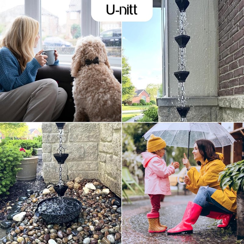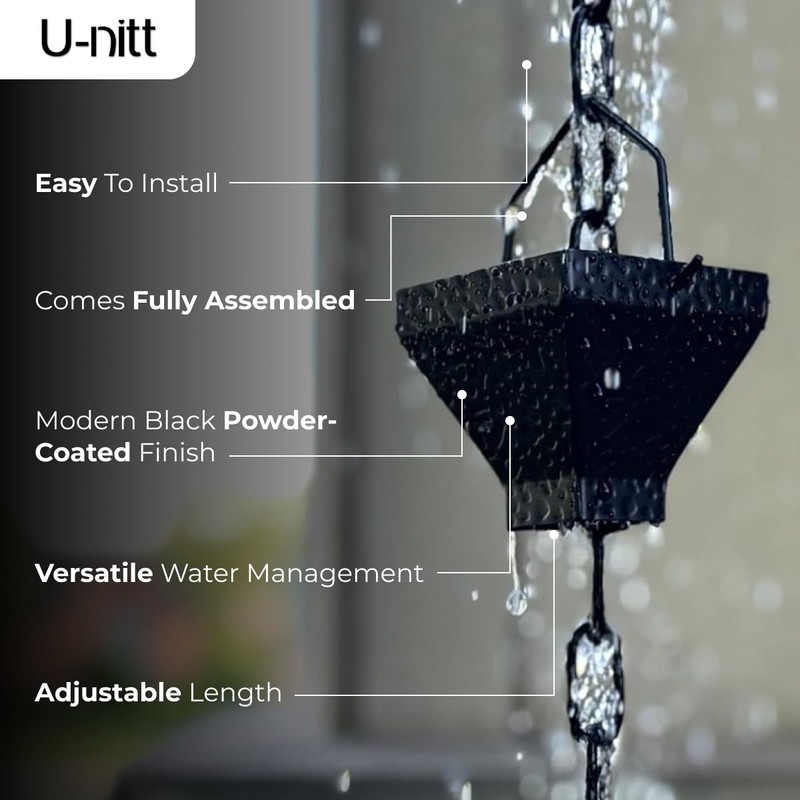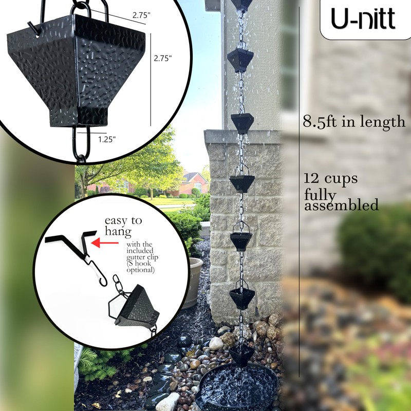 U-nitt Rain Chains for Gutters | Rainwater Catcher & Diverter | 8.5 FT Metal Black Rain Chain | Powder Coated w/Textured Square Cups | Roof Gutter Chain Downspout | DIY Rain Chain Installation Kit