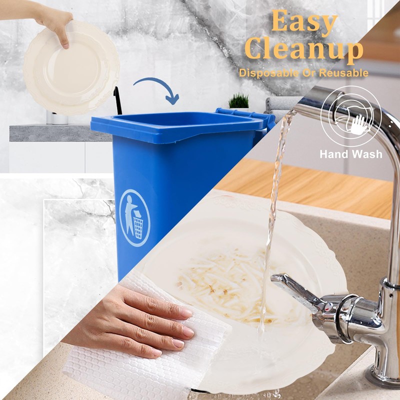 - Expected Use: Our premium hard plastic plates are 100% disposable and you can throw them away directly after the party. However, due to this novel design and exquisite appearance, you can choose to clean and reuse.