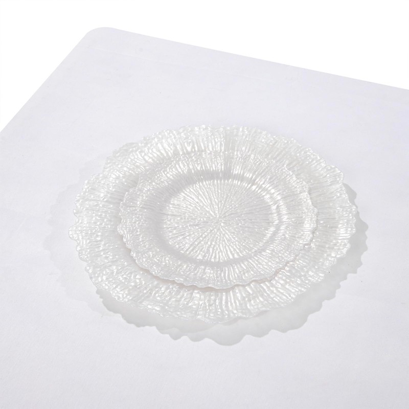 - Please note: These products are not charger plates, but 30 10 inch plastic plates and 30 7-inch dessert plastic plates.Besides, due to their unique design, the concave area of the dinner plate measures approximately 5.7 inch in width, while that of the dessert plate is approximately 3.9 inch in width.The color of the plates may vary under different lighting conditions, when stacked or placed individually, or when viewed from different angles. Please be sure to take this into consideration before making your purchase.