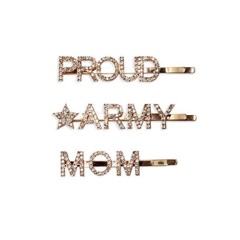 - Officially Licensed rhinestone encrusted text spells out "Proud Army Wife", "Proud Army Daughter", or "Proud Army Mom" across 3 pins