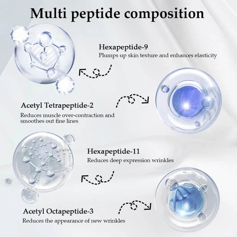 🔬 Peptide Complex: Composed of various peptides, including Hexapeptide-9, Hexapeptide-11, etc. These peptides promote collagen production, enhance skin elasticity, and reduce the appearance of fine lines and wrinkles.
