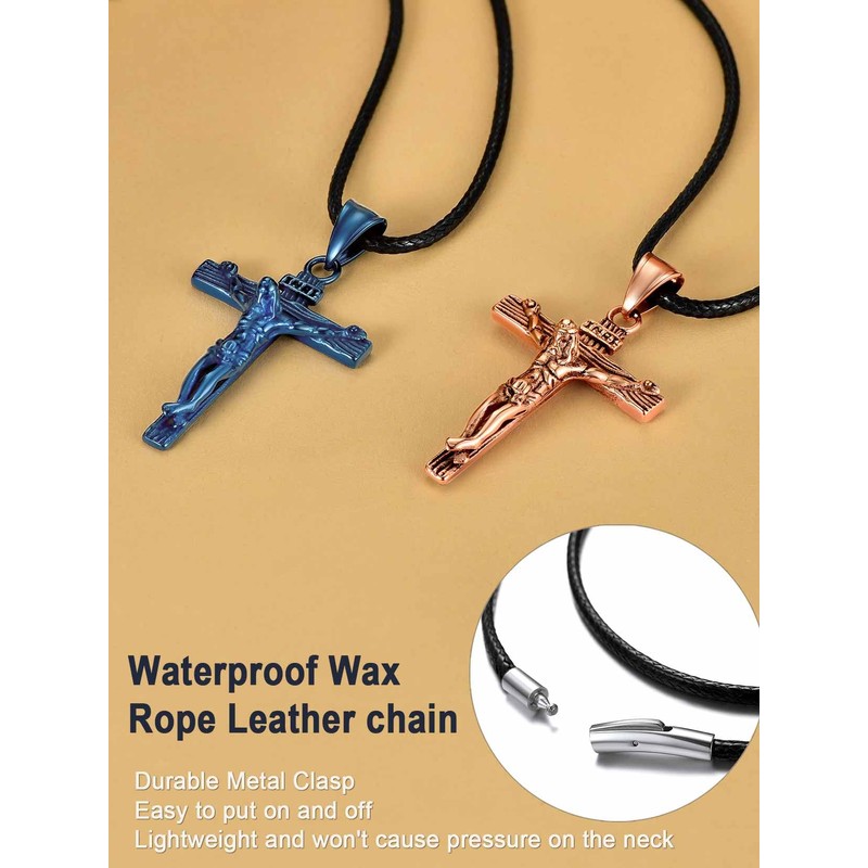 U7 Blue Plated Cross Pendant Crucifix Jewellery for Men Women Black Leather Wax Rope INRI Jesus Christian Necklace