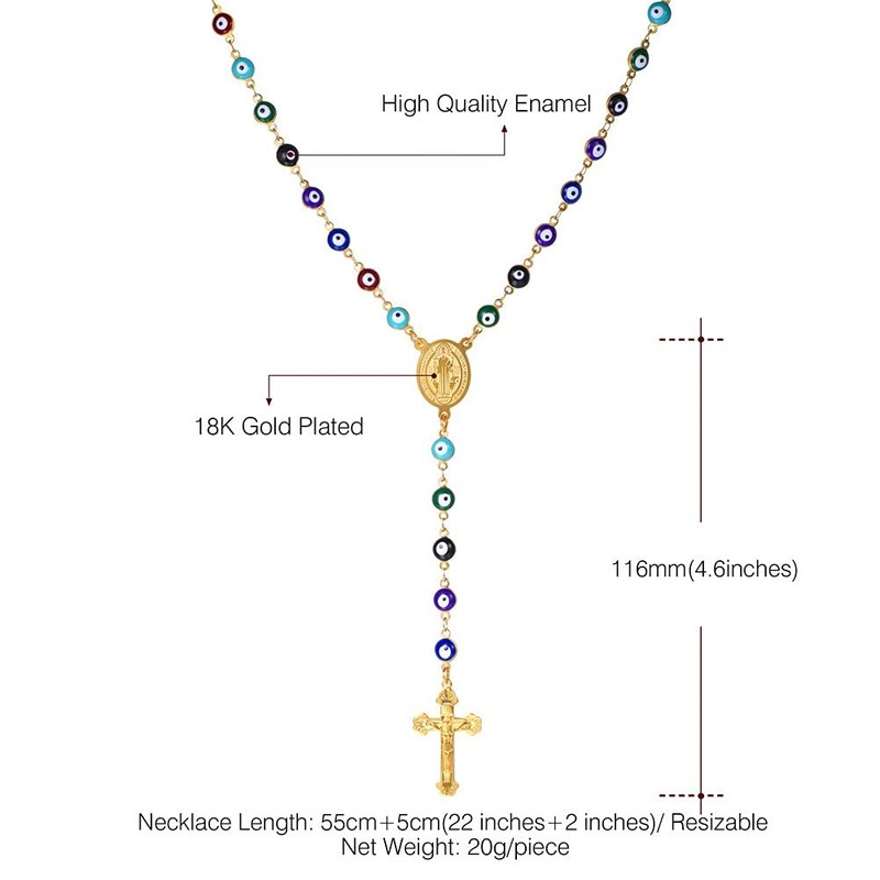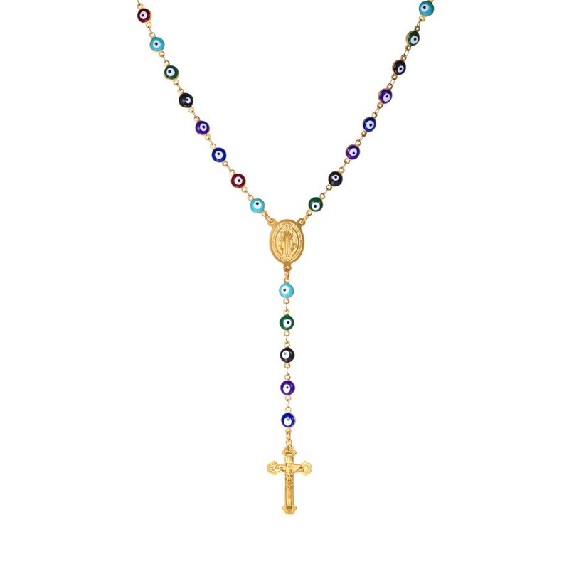 U7 Women Mens 18K Gold Plated Stainless Steel Link Colorful Evil Eye Beaded Rosary Necklace With Crucifix and Medal