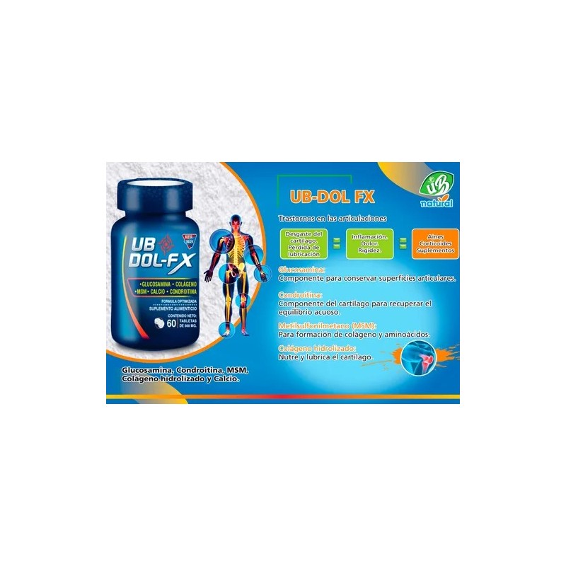 UB DOL-FX ayuda a mantener el colágeno en todo el cuerpo especialmente en la piel, cartílagos, favoreciendo la recuperación del cartílago deteriorado y contribuir a mejorar la lubricación y movilidad de las coyunturas.