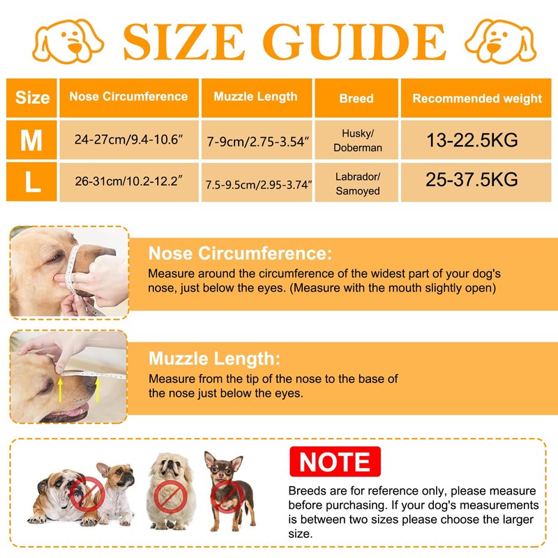 - [Size]: The dog muzzle size M is suitable for dogs with a nose circumference of 24-27 cm and a snout length of 7-9 cm, such as huskies, dobermans and shepherds; the size L is suitable for dogs with a nose circumference of 26-31 cm and a snout length of 7.5-9.5 cm, such as Labradore. Please measure the nose circumference and nose length of your dog before purchasing