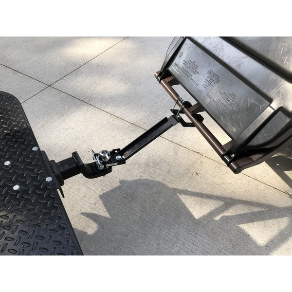 Great for ATV / UTV, Golf Carts and other ball mounts that you need to add the extra operating height. Garbage Hooks make the job easier, safer and save time, no matter how bad the weather can make it. *Works on multiple surfaces: grass, gravel, uneven pavement, and even mud and snow. * Ball mounts allow the cans to pivot smoothly around curvy driveways during transportation. *Garbage Hooks install & remove in seconds. * Lightweight at only 4lbs and are an affordable solution for making trash day quicker, safer. *No more lifting, loading, or trying to hold onto them while driving them down the driveway. * Your operating height is determined by the height of your ball hitch. Note: with ATV / UTVs when not in use we recommend removing your garbage hauling hitch and storing to avoid damage from unit hitting the rear wheels.
