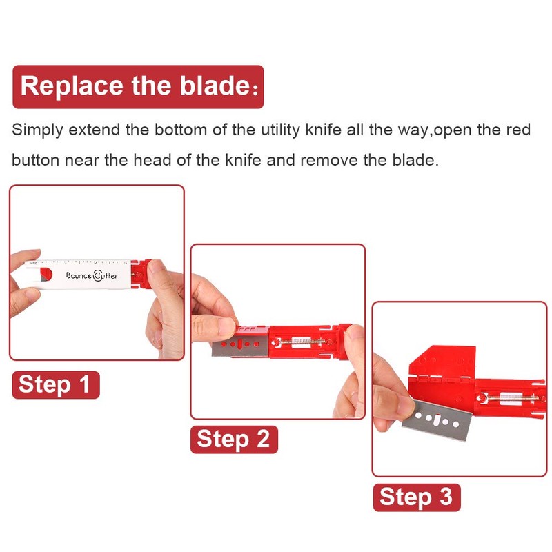 • SAFE BOX CUTTER : When the cutter knife needs to be replaced, simply extend the bottom of the box cutter knife all the way, open the red button near the head of the box knife and remove the blade. Retract the blade holder and the new blade will auto-reload, Great desgin for fast-paced operation