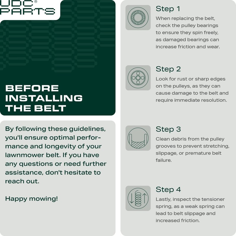 - UDC Mower Belt ensure smooth running in typical lawn and garden machines where stop-and-start operations are commonplace. There is excellent adhesion to both tensile members and other fabrics, and the outer cover has a lowered coefficient which shows extreme resistance to belt turnover or roll.