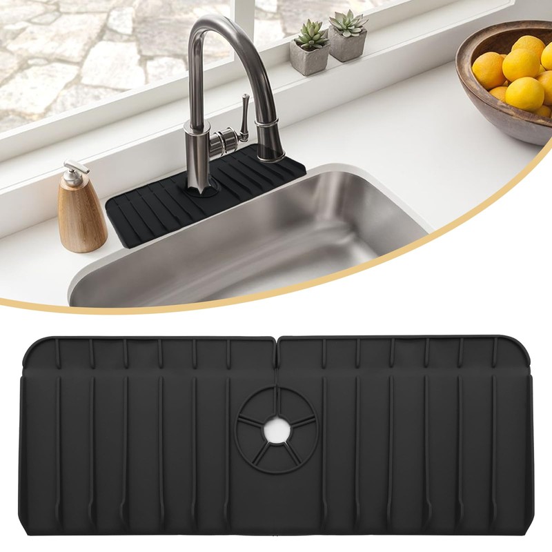 - Scopy of Use -- Measuring 37cm x 14cm/14.5" x 5.5", the faucet sink mat is suitable for your bathroom, kitchen facuet, RV and restroom. Adjustable central hole of the faucet pad fits for faucets up to 2.36" in diameter.