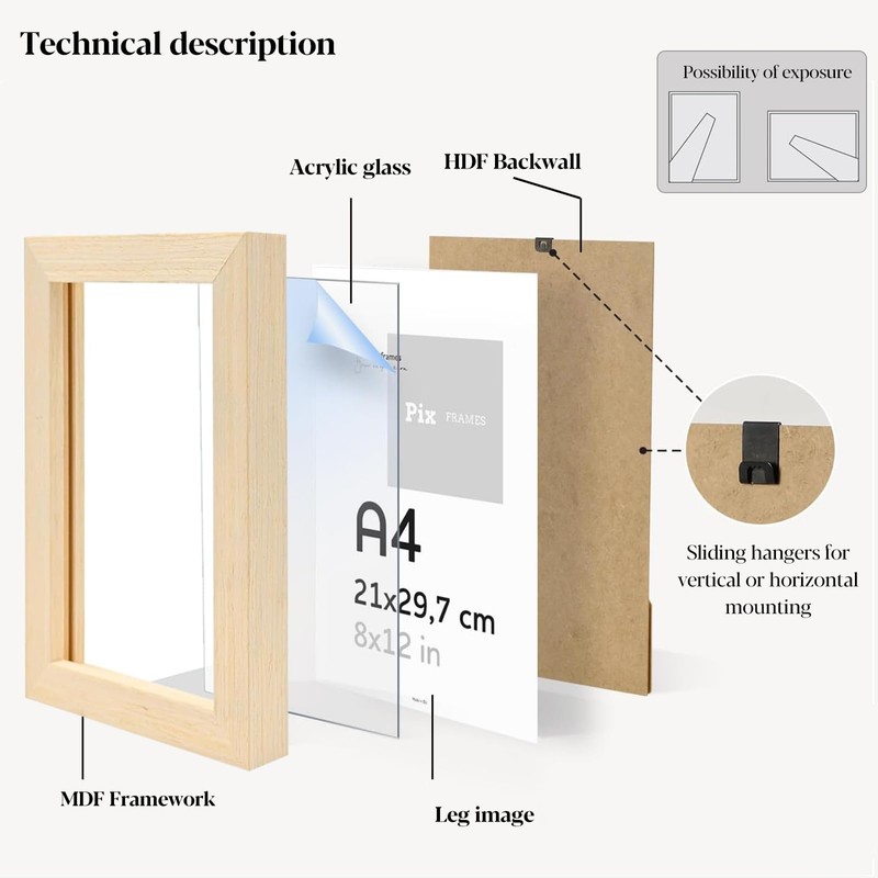 - What you get: This oak picture frame in A4 (29.7 x 21 cm) and 4 x 6 inches (10 x 15 cm) and a frame strip thickness of 1.2 cm, in oak colours with shatter-proof acrylic glass