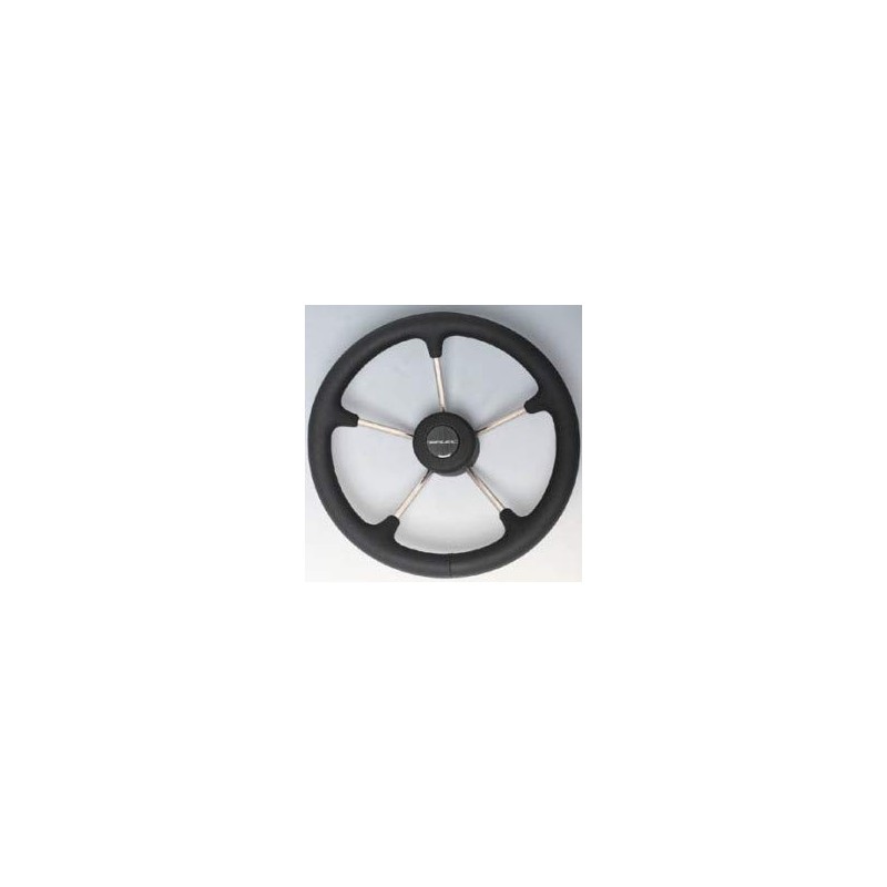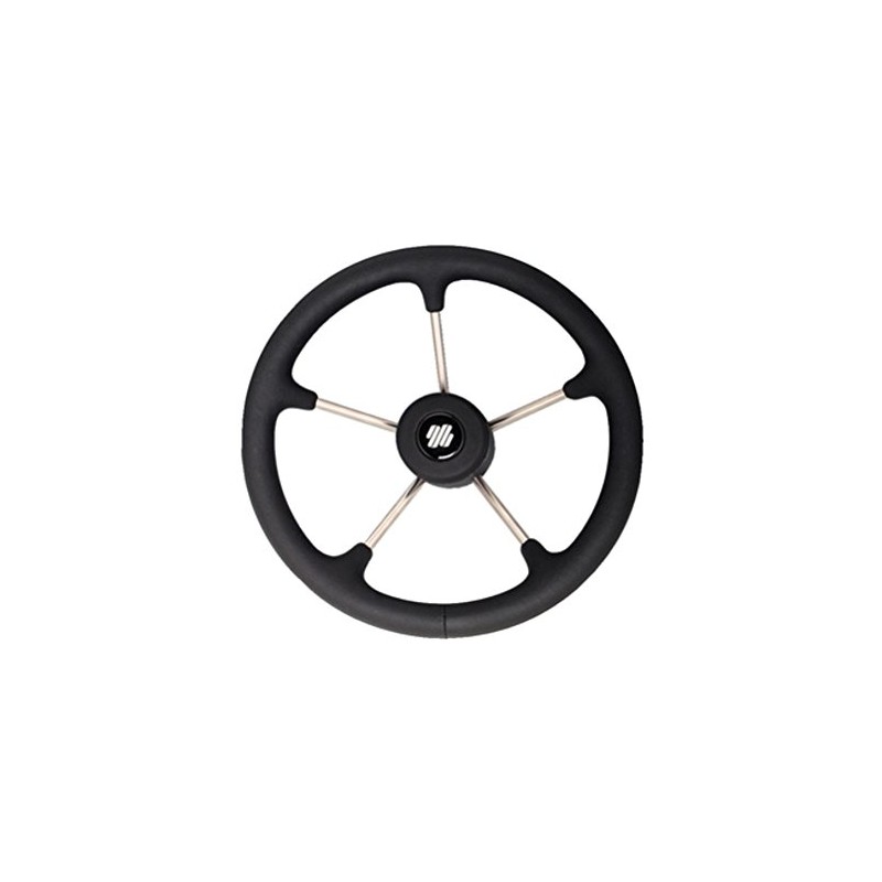 Thermoplastic antishock material. Standard 3/4" taper. Die cast aluminum hub included. Meet with the EN 28848 and ABYC P22 standards. Black polyurethane firm grip. Stainless steel spokes. 13.8"