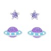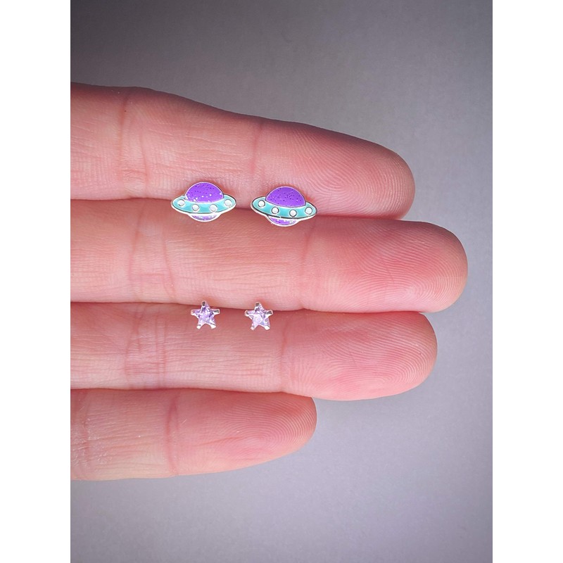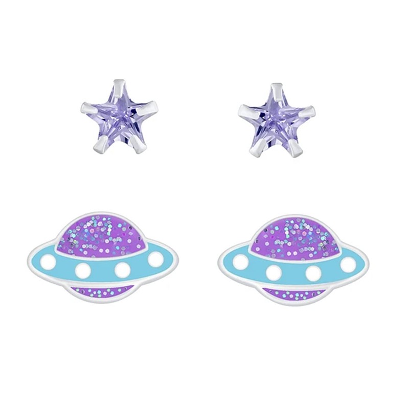 UFO and Star Stud Earrings Set of 2 - Sparkly Purple - 925 Sterling Silver
