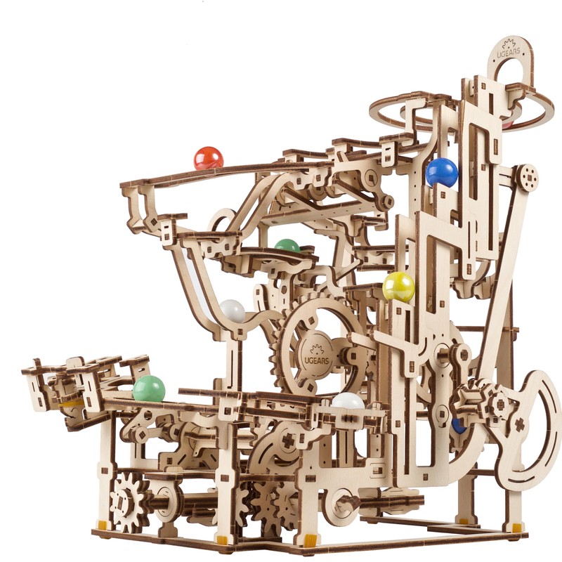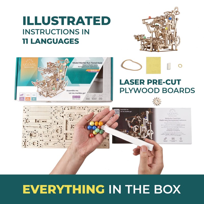 - 【Crystals of Arts and Engineering】UGEARS Marble Run Tiered Hoist features 3 main marble tracks, 3 stair lifts, and an interesting rigging and release mechanism. Learn the interaction of mechanical and driven gear and counterweight functions while building this creative wooden three-dimensional puzzle