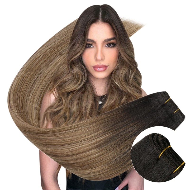 Ugeat Weft Hair Extensions Brown Sew in Hair Extensions Real Human Hair Double Weft Darkest Brown Mix Medium Brown with Blonde Balayage Hand Hair Weft Hair Extensions Sew in 16inch 105G