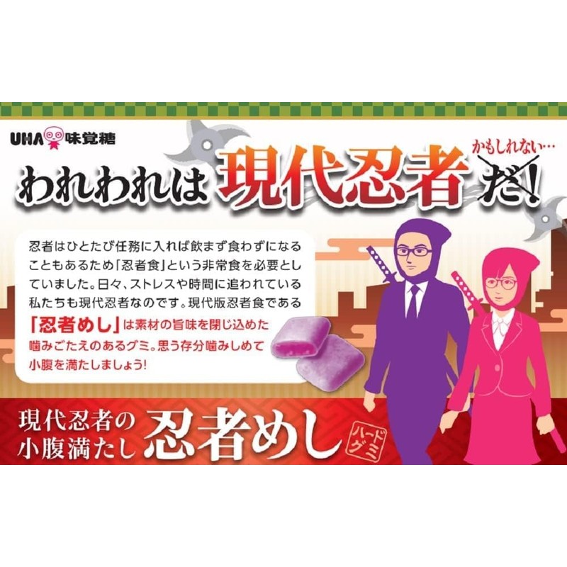 Experience the bold flavor of Kyoho grapes in every bite with UHA Mikakuto Ninja Meshi gummies. 2 packs with 20 pieces – perfect for on-the-go snacking.