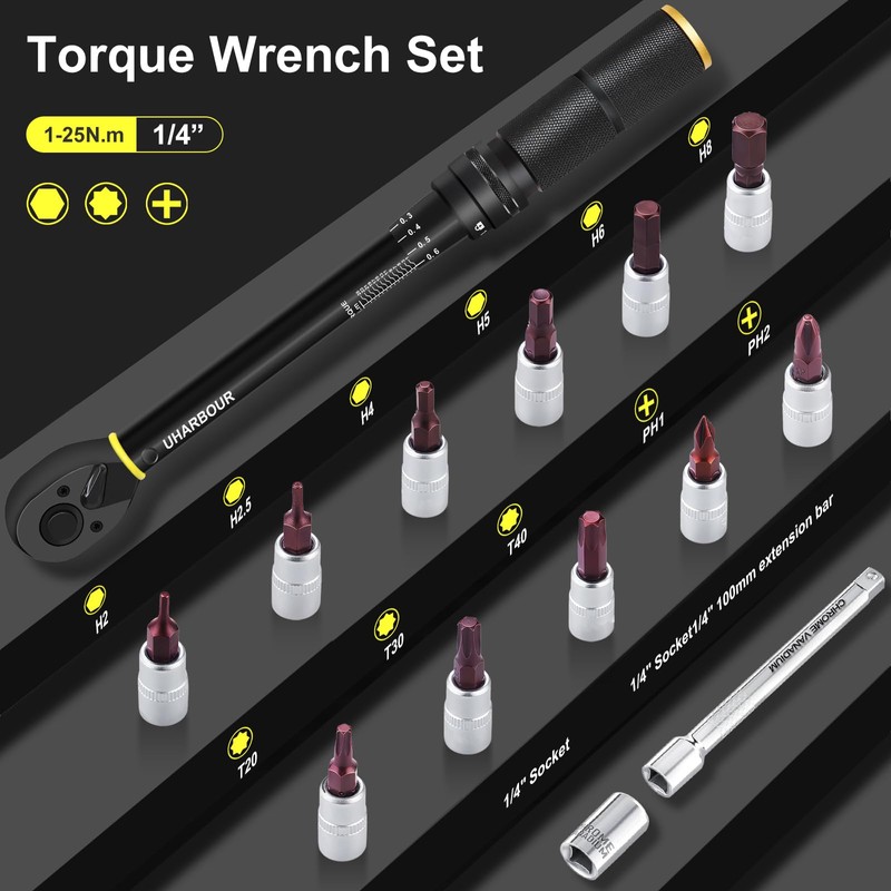 Uharbour Torque Wrench Bicycle 1-25 Nm, Torque Wrench 1/4, Bicycle Torque Wrench Set with Bits and Extension Rod for Bicycle, ±3% Error Accuracy Torque Wrench Small