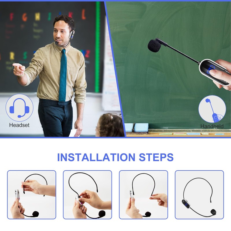 - đ€[Headset & Handheld 2 in 1] FCC certified UHF independent frequency bands, high-sensitivity condenser microphone. Two ways of use: As a normal headset microphone, or remove the bracket to become a handheld microphone, and perfectly fit the head. The wireless the headset microphone is suitable for fitness, yoga, teaching, singing, lectures, conferences, tour guides, etc