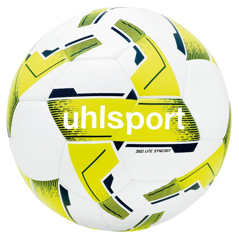 uhlsport 350 Lite Synergy, Junior Play and Training Ball, Football, for Children Between 10 and 12 Years, Size 5, White/Fluo Yellow/Navy
