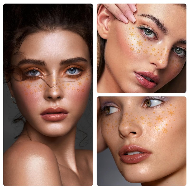 - [Effortless Application]: Effortlessly achieve a touch of with our freckles tat-too. Peeling, applying, and setting our facial glitter speckle patches is seamless transforming your look with natural-looking gold stardust speckles makeup patches in minutes