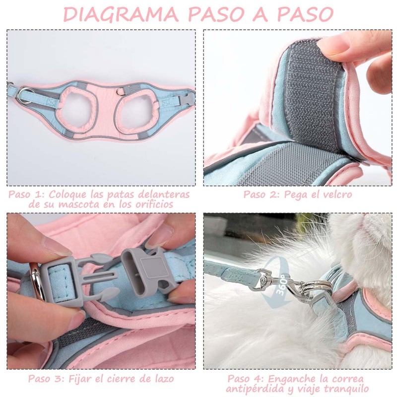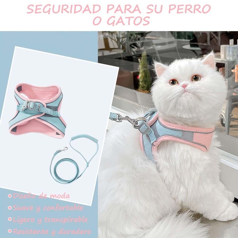 - Set de Arnés para Perros o Gatos: Pechera para perros o gatos con correa 1.5m de color a juego, la parte de la correa tiene un diseño anti-estrangulamiento y el pechera tiene un diseño de doble protección con velcro más un mosquetón para evitar que se suelte.
