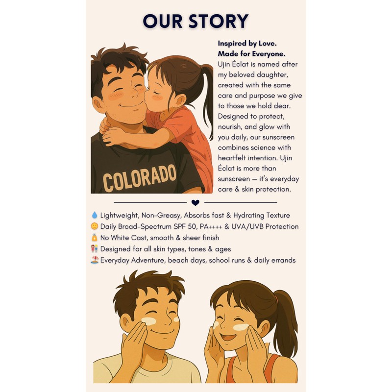 Meet the sunscreen for every skin tone: Ujin Eclat Mineral Sunscreen SPF 50 PA++++. The formula protects from UVA and UVB rays and is broad spectrum. The weightless, fast-absorbing sunscreen is formulated with micronized zinc oxide. It has a natural finish and does not leave a noticeable white cast. It is suitable for all skin tones and types, even acne-prone skin. This sunscreen is smooth, hydrating, and protective without leaving behind no greasy residue. Embrace sustainability with our eco-friendly sunscreen! Our packaging is crafted from recycled paper, promoting environmental consciousness. When you choose our sunscreen, you're not only shielding your skin from harmful UVA and UVB rays but also contributing positively to the environment. Protect your skin and nurture nature with every purchase. Give your skin the protection it needs! This Broad Spectrum Sunscreen is designed to protect and hydrate! Our formula contains 11% zinc oxide to shield the skin from harmful UVA and UVB rays. It has a minimal, practically invisible white cast and is super fast-absorbing, making it the perfect sunscreen to layer with other skincare products and makeup. On top of providing powerful protection to help your skin stay healthy and prevent premature aging, this formula is also nourishing and soothing! Your skin will thank you. Prioritize protecting your skin from the effects of sun exposure with this easy-to-apply, easy-to-take with you! Apply liberally 15 minutes before sun exposure, and be sure to reapply at least every 2 hours for continued protection and hydration. Face the day confidently and keep your skin healthy and glowing. Thank you for choosing us! If you love our product, a review would mean the world to us