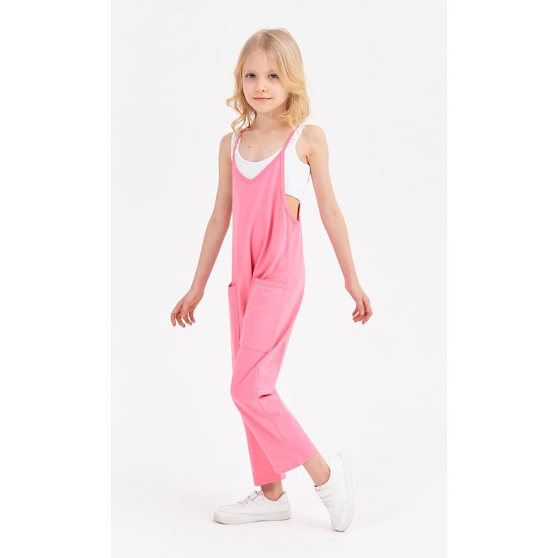 UK loees Jumpsuits for Girls Kids Casual Sleeveless Jumpsuits Spaghetti Strap Romper Long Pants with Pockets Pink