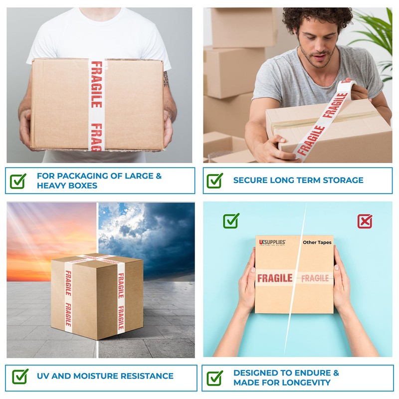 - VERSATILE USE: Ideal for packing, sealing, and securing parcels, boxes, and other items, this box tape is suitable for home, office, and warehouse applications. With brown parcel tape, clear parcel tape, and fragile packing tape options, it meets all your packing needs, from securing heavy boxes to marking fragile items.