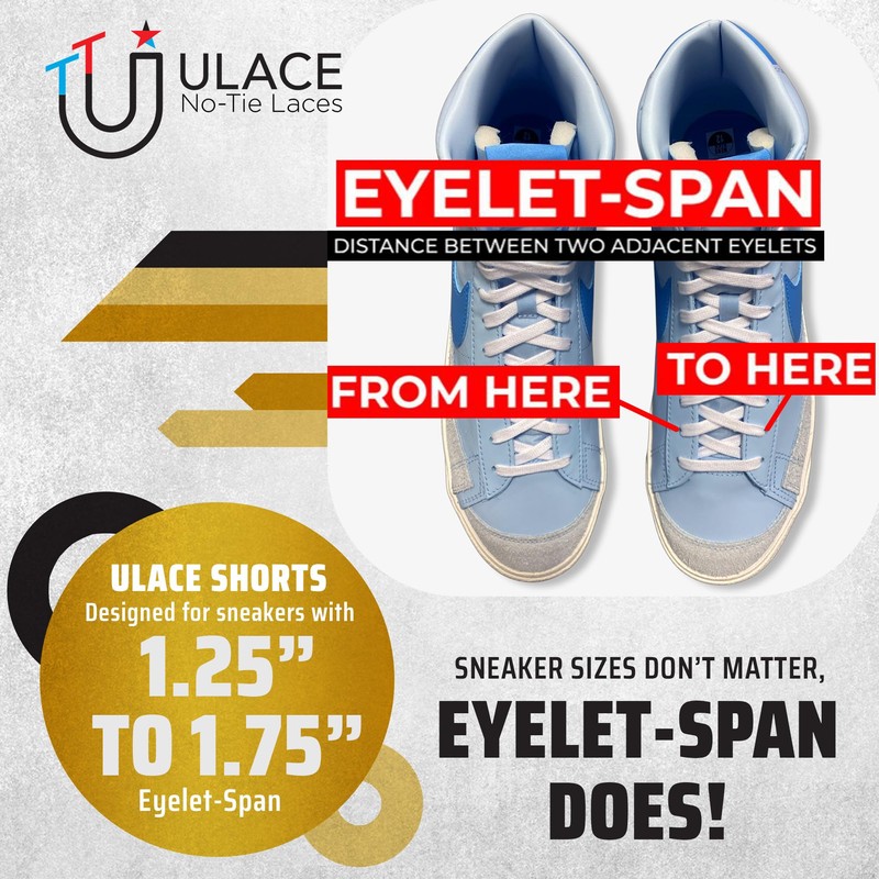 - Versatile for Every Generation: uLace caters to all ages with no-tie shoelaces for adults, teens, and children. With our 4 modular uLace sizes— Classics for sneakers with wide eyelet spans (2.25" to 4.25"), Slims for sneakers with medium eyelet spans (1.75" to 2.25"), Shorts for sneakers with narrow eyelet spans (1.25" to 1.75"), and Kiddos for Kids's sneakers with medium eyelet spans (1.75" to 2.25").