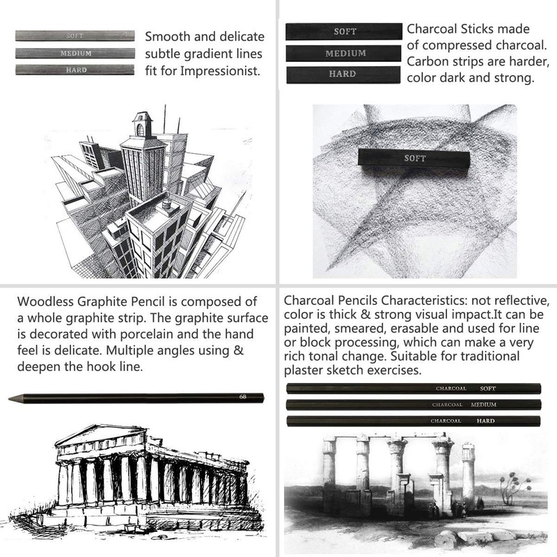 - ✎ VARIETY OF PENCILS - Drawing pencils include 8B, 6B, 5B, 2x4B, 3B, 2x2B, B, 2xHB, 2H, 3H, 4H and 5H, charcoal pencils & sticks and graphite sticks with different hardness: soft/ medium/ hard, grant you all ranges of shades and enhance your sketching technique.