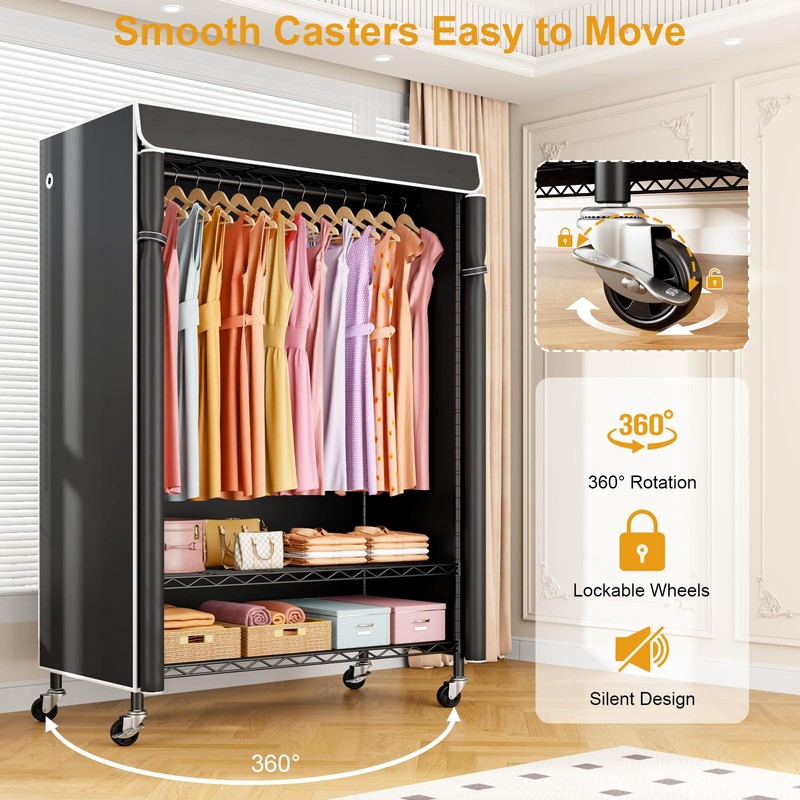 - Flexible Movement & Secure Locking: The rolling covered clothes rack features four 360° swiveling rubber wheels (2 with lockable brakes) for smooth movement across any floor. It provides easy access to bedrooms, cloakrooms, laundry rooms, walk-in closets, and more. Locking two wheels keeps the rack secure