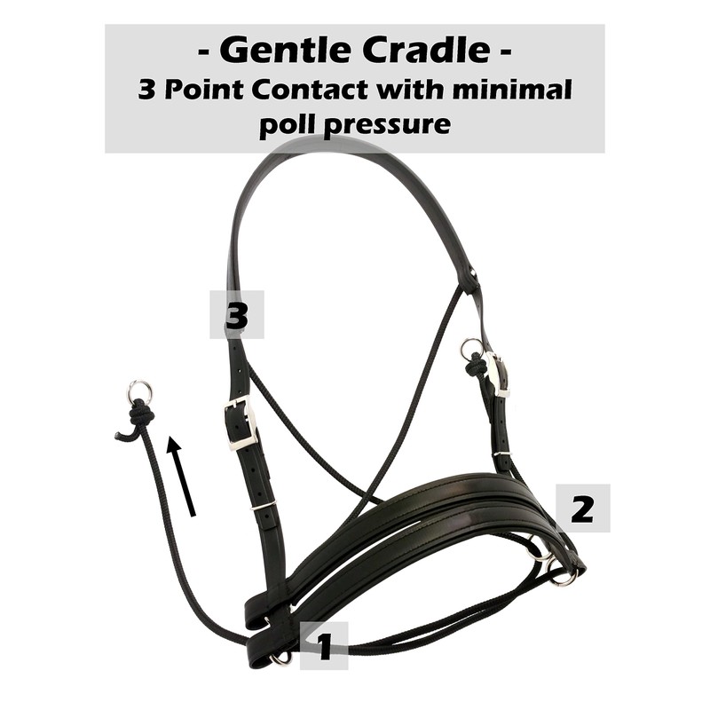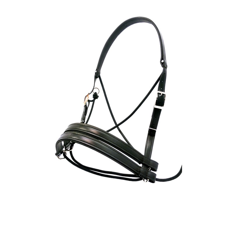 • 3) Connection - The UBB has built in ELASTIC for a quick release and soft contact. The opposing pressure points created by the double noseband system, balance rein pressure on the nose (no twisting or movement of the bridle) with much less pressure being transferred to the poll when compared to similar cross under strap bitless bridles.