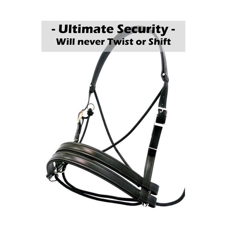 • US Patent No. 8,789,349 - A Revolution in Bitless Bridle Design - Unique Double Noseband Double Crossunder Reinstraps automatically adjust underneath the jaw. What makes this the 'Ultimate' Bitless Bridle (UBB)?