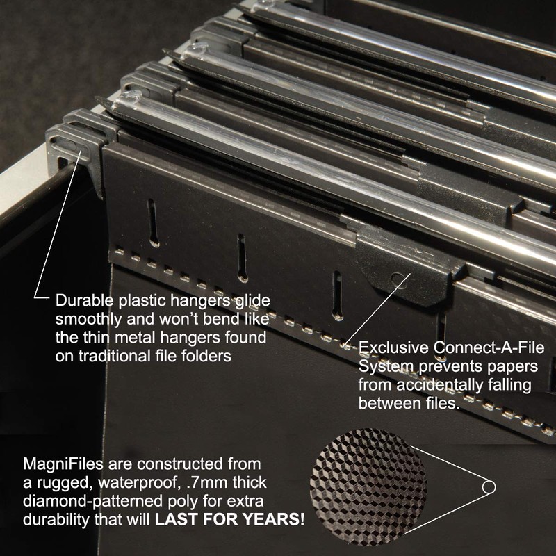 • de por vida: los limas colgantes tradicioles en hechos de papel que se rasga, ganchos que se doblan fácilmente y etiquetas que a menudo necesitan reemplazar. Todos los productos MagniFile están fabricados con polipropileno negro resistente a derrames, a prueba de desgarros y vienen con una de por vida incondicional Cómpralos una vez. . . Úsalos para siempre