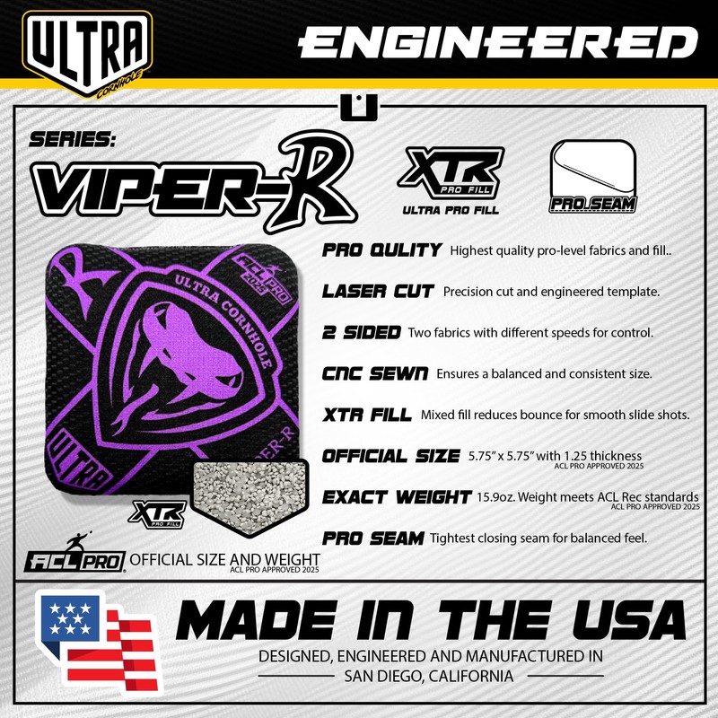 - Two different fabrics: Ultra Cornhole's Viper-R bags utilize two unique fabrics to optimize game play. The fast side is made for speed and durability. The hybrid-carpet slow side is perfect for cutting and rolling bags.