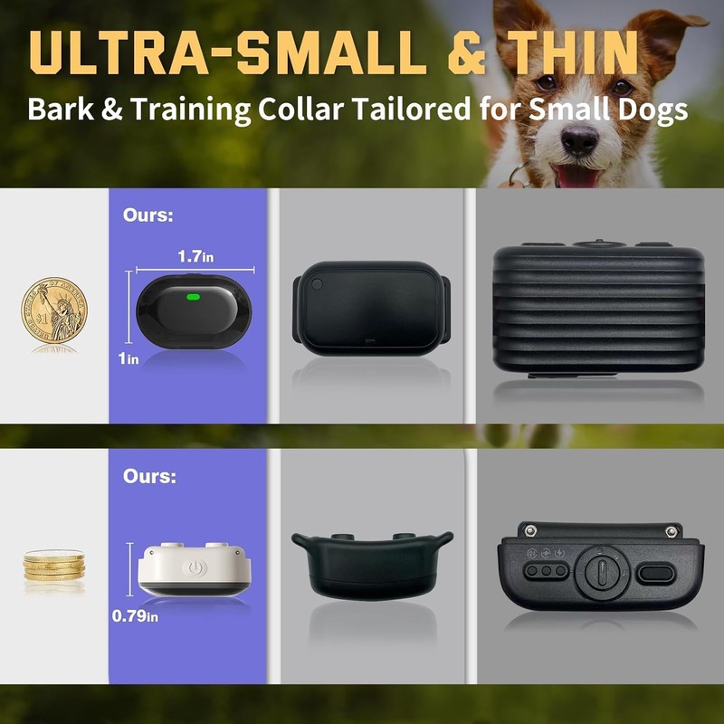 - 【Ultra-small/Light/Thin Design】This anti bark and training collar is the ultra-small/light/thin collar on the market, measuring only 1*1.7*0.79 inches and weighing just 0.8oz. It is specifically designed for small dogs with neck sizes between 6 and 19 inches. The collar comes with a breathable, adjustable, and comfortable strap.
