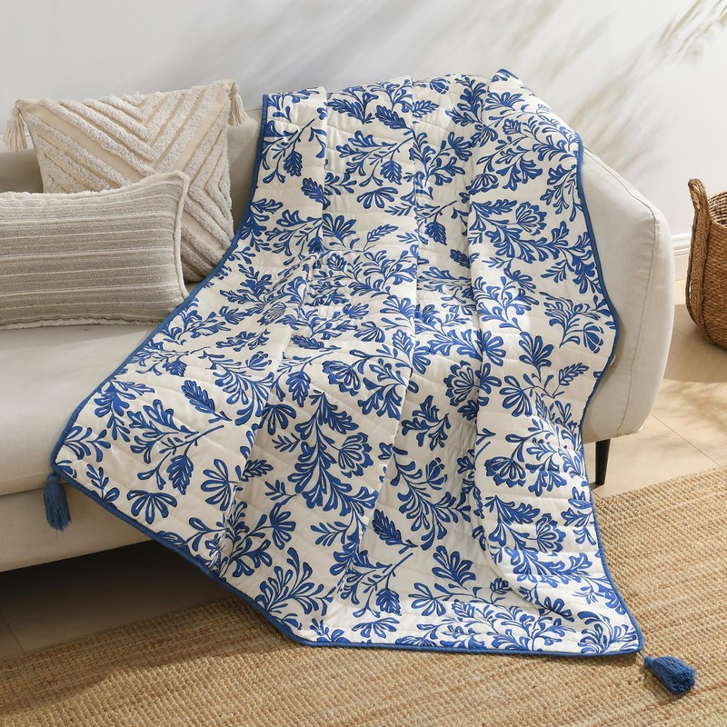 Ultra Soft Pre-Washed Quilted Throw Blanket, Floral Printed Tassels Fringed Blue and White Decorative Throws, Chic Rustic Blanket for Sofa Couch Bed Chair, 90"x 90"