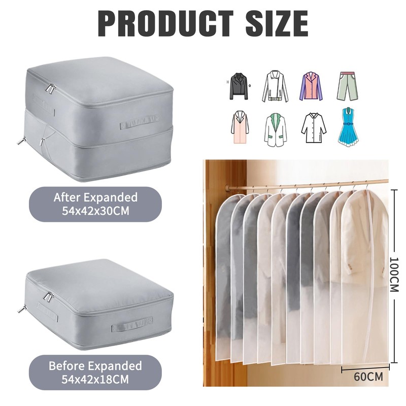 • Self Compression Organiser of Unique Design: With adjustable sizes and a dual-layer zipper design, with a top opening and a top zip that opens fully,you can effortlessly expand capacity based on your needs. Enjoy the flexibility to store various types of clothes and items without the worry of deformation or wear