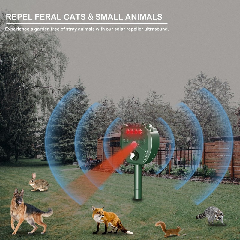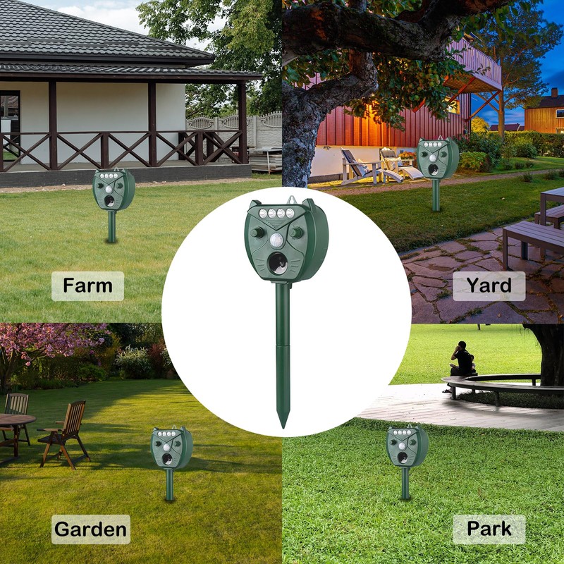 - Safe and humanized design: The outdoor squirrel repellent is only designed to drive animals away from the garden. Passive infrared sensors detect movement and trigger it, then ultrasonic speakers emit noise, scaring away squirrels, deer, raccoons, rabbits, cats, dogs, skunks and foxes from the farm yard and garden